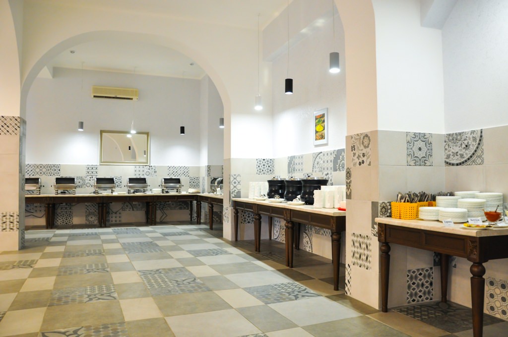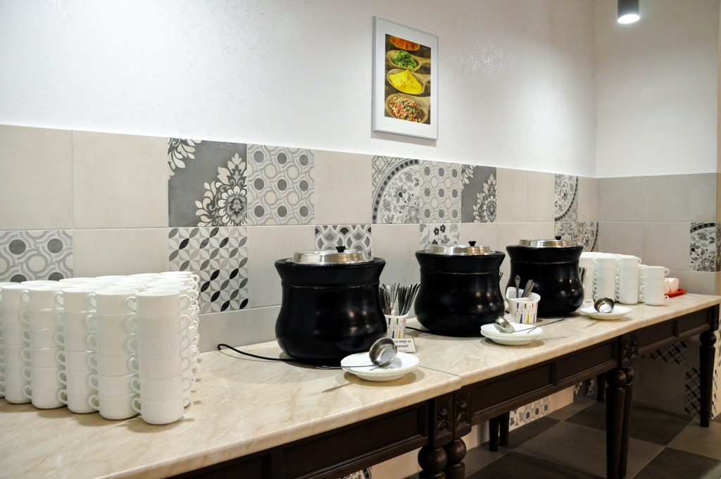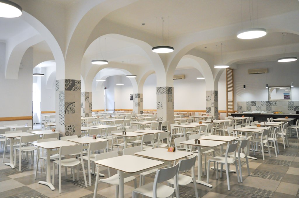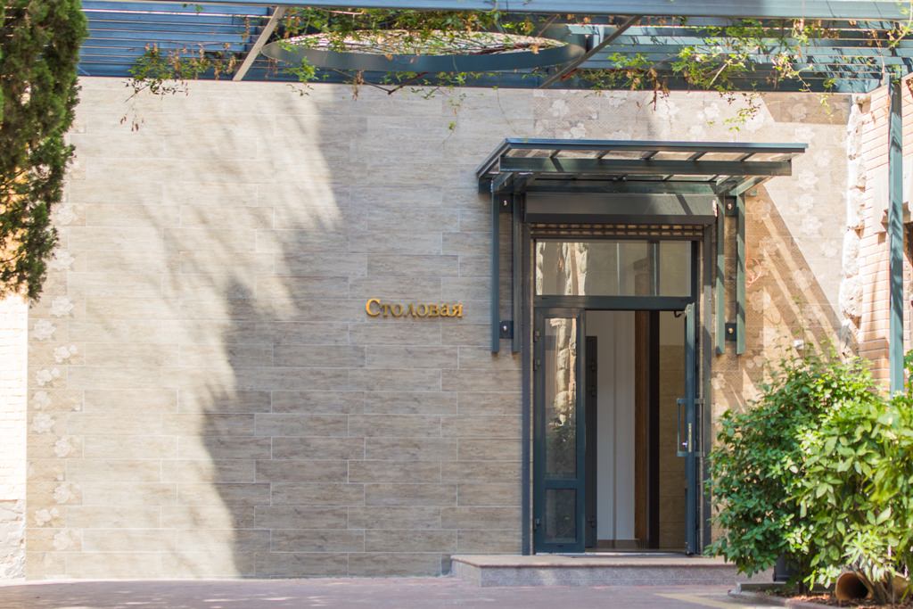Столовая в санатории имеет просторный зал, в котором чувствуется атмосфера комфорта и уюта, оформлен в светлых тонах, и отдыхающие могут здесь самостоятельно выбирать блюда на свой вкус со «шведского стола».