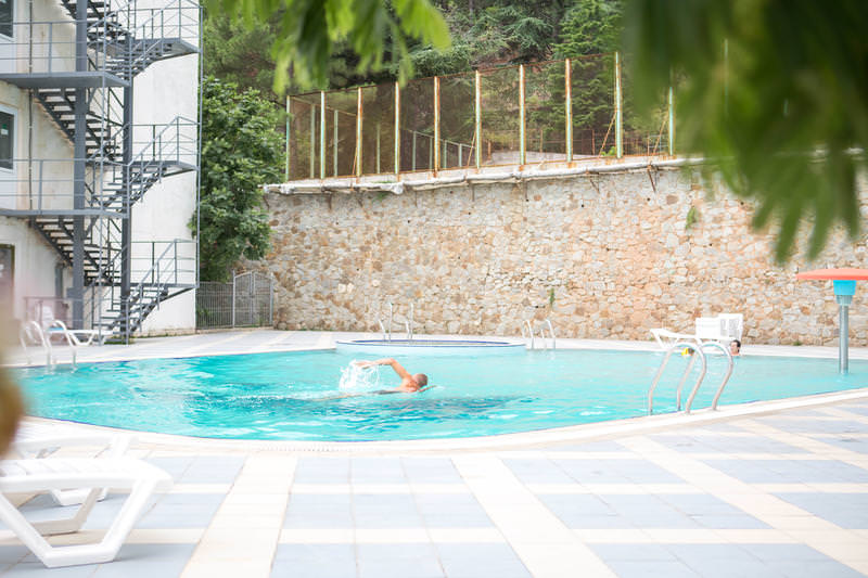 В санатории «Утёс» есть замечательный бассейн, в котором можно вдоволь накупаться, а плавание, как известно, дарит положительные эмоции и положительно влияет на организм.